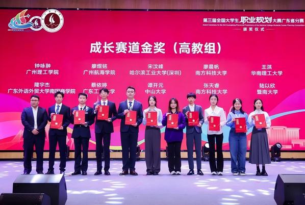 本网讯1月31日,第三届全国大学生职业规划大赛广东省决赛在广州航海学院圆满收官。我校计算机科学与技术专业学生隆宇杰荣获成长赛道(高教组)金奖,并晋级国赛排位赛,实现我校在该项赛事的历史性突破。隆宇杰同学斩获成长赛道(高教组)金奖(右四)大赛自去年10月启动以来,吸引了全省165所高校的145万余名学生报名参赛,历经多轮选拔,最终全省174名选手脱颖而出,晋级此次的全省总决赛。隆宇杰赛后接受采访时分享了自己的职业规划。他表示,自己的目标定位是成为一名人工智能训练师。这一选择源于他对人工智能发展趋势的观察,也与自身的计算机专业背景相符。在谈到如何确立这一方向时,他提到,学校组织的各类AI论坛和专题讲座帮助他加深了对这一领域的理解,从而明确的职业发展方向。关于实现目标的步骤,他制定了系统的三步走计划:首先夯实专业基础,通过课堂学习掌握核心知识;其次以赛促学,通过专业竞赛提升实践能力;最后通过实习锻炼,积累项目经验。赛场合影留念据了解,学校为本次赛事提供了系统支持。自去年10月赛事启动以来,学校制定了专门工作方案,通过组织校级选拔、安排专家指导、反复打磨参赛作品等环节,全程支持学生备赛。这一成