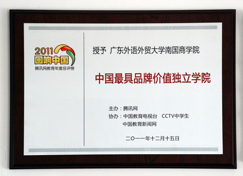 本网讯 近日,2011“回响中国”教育年度盛典在北京香格里拉酒店隆重举行。我院荣获“中国最具品牌价值独立学院”荣誉称号。 我院获得“中国最具品牌价值独立学院”荣誉称号 此次“回响中国”活动由腾讯网主办,中国教育电视台、CCTV中学生频道、中国教育新闻网等媒体协办。活动邀请多家媒体组成顾问团,集合全国六十多家主流平面及网络媒体共同开展,对2011年国内教育行业进行了一次大回顾,并对为中国教育事业做出贡献的机构和单位进行了表彰。
