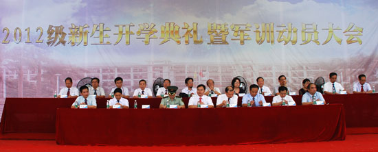 本网讯(记者 张杰玲 刘臻)9月9日上午,2012级新生开学典礼暨军训动员大会在商业街广场举行。一大早,新生们身着崭新的军服,头戴军帽,以良好的精神风貌迎接这“大学第一课”。统一的军装汇成了一片迷彩的海洋,成为一道亮丽的风景线。