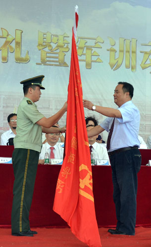 随后,杨永强宣布2012级新生军训开始,并向军训团授团旗。2012级新生军训正式拉开帷幕。
