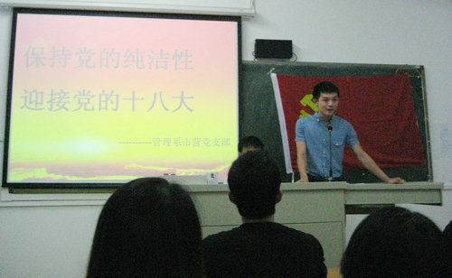 会上,管理系市营、旅游、物流、会计等各党支部党员进行了形式不同的学习活动,讨论了“如何保持党的纯洁性”等一系列问题,各支部书记也作了相关的总结。会后,党员们表示,此次讨论学习,让他们了解作为一名党员的责任和保持党的纯洁性的重要性。他们将从身边做起,从点滴做起,在日常生活中发挥党员的先锋模范作用。 (管理系 何思萍)