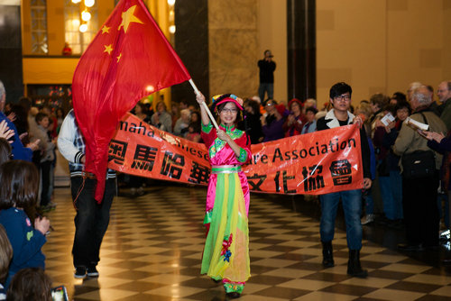 郑一楚在奥马哈国际艺术节上展示中国国旗