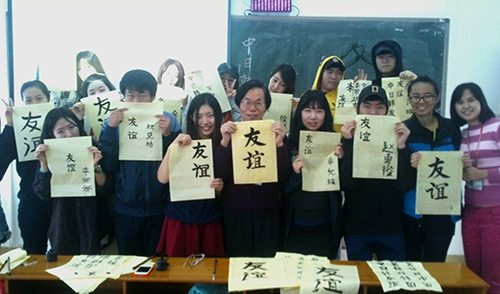 交换生用毛笔写下“友谊”二字