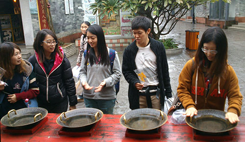 在参观充满着传统文化气息与中国韵味的岭南文化印象园的过程中,韩国的交换生觉得中、韩两国的建筑文化有一定的相似之处,而日本的交换生则被“糖画”的魅力所吸引。