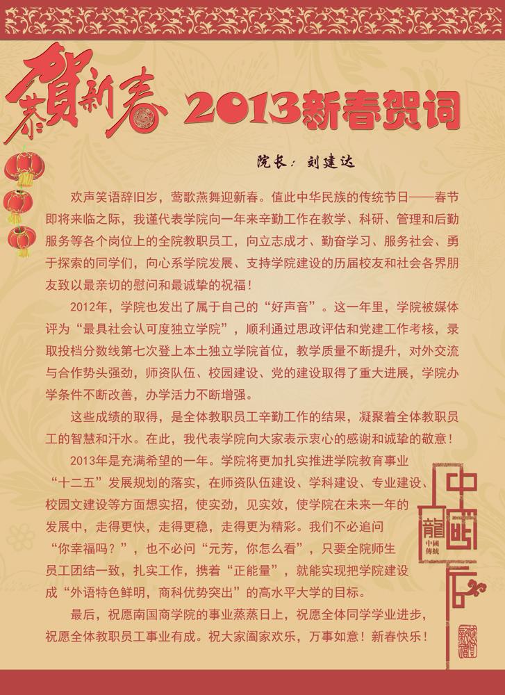 最后,祝愿南国商学院的事业蒸蒸日上,祝愿全体同学学业进步,祝愿全体教职员工事业有成。祝大家阖家欢乐,万事如意!新春快乐!