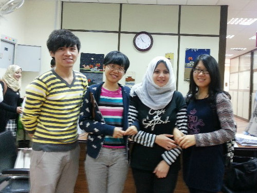 他们被分配到高级班上课,比班里其他同学落后了5个月的课程。老师在课堂上是用纯阿语教学,语速也比较快。由于没有在阿拉伯语环境中生活过,刚开始他们觉得学习比较吃力,所以要付出比同班同学多几倍的努力。一个月下来,情况慢慢改善了,他们能在课堂上自如地向老师提问,或表达自己的意见。各科老师也都称赞他们的进步神速。