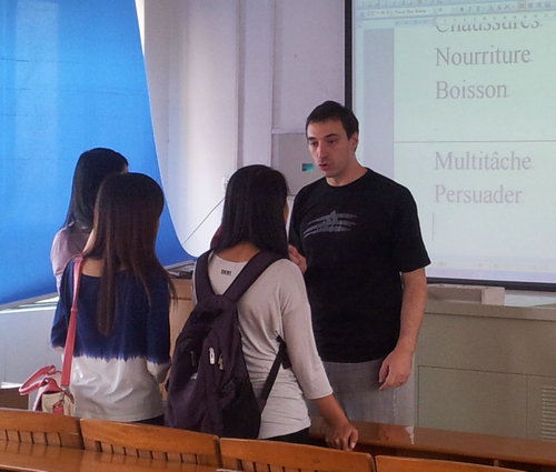 在文学和商务课上,他经常通过玩游戏的方式,让学生在轻松的氛围中学到知识,运用知识。写作课上,他则将讲解和练习相结合。他认为,学习语言,最重要的是实践。他的学生小徐告诉记者,Mathieu讲课图文并茂,且有“憨豆先生式”的幽默。他不支持学生死记硬背,而是鼓励同学们每天花十分钟的时间用法语相互交谈。在这样一位“引路人”的帮助下,同学们在学习上不断进步。