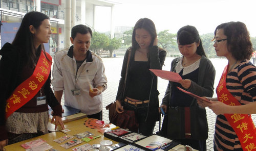 本网讯 4月2日上午,图书馆四月读书节活动在商业街正式启动。图书馆工作人员佩戴着“读书活动大使”的红色绶带,向师生读者分发读书节活动的宣传单。宣传现场还展示了此次读书节的各种精美奖品,吸引了很多读者前来观看和咨询。