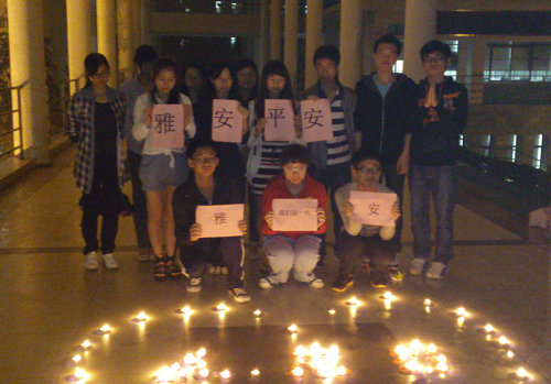 本网讯 四川雅安地震牵动着我校学子们的心,大家纷纷通过各种方式表达对灾区人民的深切关心和祝福。4月22日晚,信息科学技术系学生在教学楼F栋2楼的空地上自发组织了“雅安平安”祈福活动。