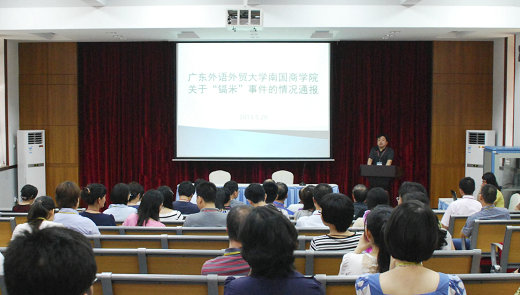 会议首先通报了学校在得知相关部门公布“镉”米餐饮单位之后(5月17日晚),18-19日所采取的一系列措施。包括:召开紧急会议,相关校领导、后勤及学生工作负责人等共同部署相关工作。召开师生代表座谈会,向师生代表公布我校大米的进货渠道和对“镉”米封存处理的情况,学生代表还到饭堂实地查看了封存大米。第一时间在校园网上公布相关信息。主动邀请媒体前来,通报情况,公布信息,截至19日,已有8家媒体到校采访。
