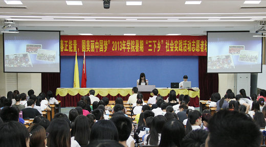 本网讯(记者 江颖诗 严泳仪)6月7日下午, 2013年暑期“三下乡”志愿者培训大会在学术报告厅C201举行。各带队老师和志愿者参加本次大会。我校2013年暑期“三下乡”社会实践活动正式启动。本次“三下乡”活动以“传递青春正能量,圆美丽中国梦”为主题。