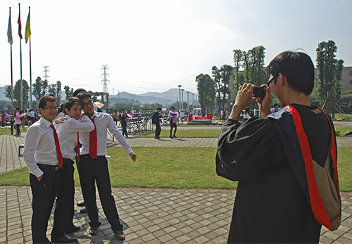 当我们戴上方正的学士帽,扣好学士袍的纽扣,扶正稍稍歪倒一边的领带,握紧绑着红线的毕业证书,将流苏拨到前面时,一起扬起嘴角的微笑,我们毕业了!(2009级西班牙语1班 吴良芊)