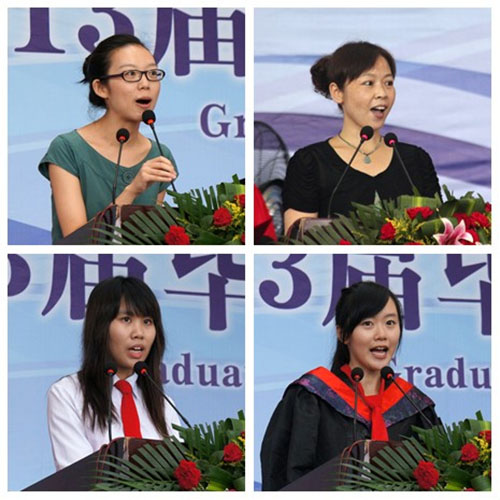 毕业生代表谢玛丽回忆了四年来同学之间团结互助的点滴真情和老师们的谆谆教诲。她表达了对母校的不舍之情,并倡导大家心怀感恩,踏出校门后仍心系母校。