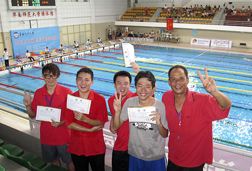 本网讯 6月22-23日,由广东省教育厅主办的2013年广东省大学生游泳锦标赛在华南师范大学游泳馆举行。全省共30支队伍齐聚大学城同台竞技。我校代表队派出4男2女参加角逐。