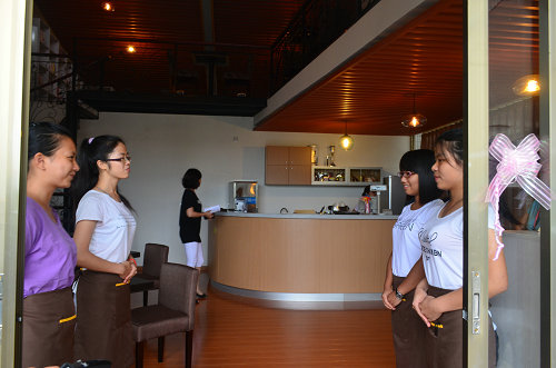 学校领导、老师经常到咖啡屋指导工作。工作人员耐心地听取了老师们的意见与建议,逐步改善咖啡屋的运作,致力用心为同学们服务,为同学们提供一个悠闲舒适的学习环境。