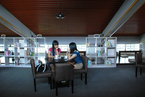咖啡屋以阁楼的形式,分上下两层,因其整体布局特色与设计风格取名为“楼阁”。内设吧台、大厅、榻榻米等。室内装修简洁雅致,错落有致的书架上摆放着不少书籍。