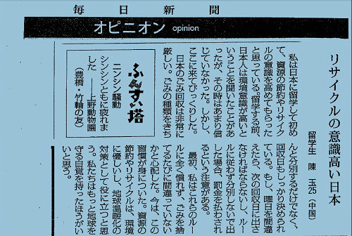 本网讯 7月8日,2009级日语专业学生陈玉的一篇名为《垃圾分类意识很强的日本》的文章在“日本三大报”之一的《每日新闻》上刊载。