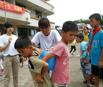上午九时,运动会在教学楼前的篮球场正式开始。为了确保小学生的安全和运动会的有序进行,体育委员郭锦源还特意为同学们上了一堂安全教育及赛前热身课。运动会的项目都由支教老师们精心准备,包括“糖果传情”、“二人三足”等十几个比赛项目。趣味运动会的目的并不是决出胜负,而是消除同学之间、志愿者与学生之间的陌生感,培养团队感情,增强团队协作能力,学会沟通合作。