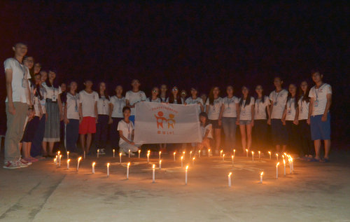 7月23日晚上9时,“牵手1+1队”全体队员在前进学校操场举行了祈福活动。在主持人宣读了甘肃定西市地震的最新灾情后,队员们纷纷紧闭上眼睛、合拢双手,为当地的灾民祈福,希望逝者安息,生者坚强。(“牵手1+1”队 陈迪 韦诗韵)