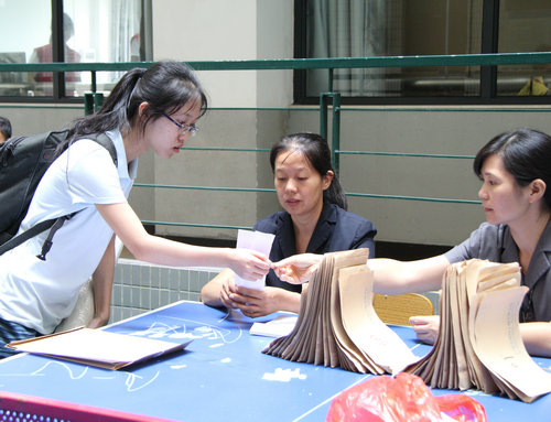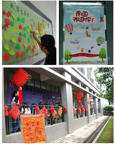 为迎接新生,各系用心布置新生报到教室,在门外显眼处张贴各系的详细简介以及相关资讯,让新生了解自己所属系的特色。如中国语言文学系的报到点贴上了由本系学生施晓所书写的对联:采得百花成蜜后,为谁辛苦为谁甜,并以有中国特色的红灯笼以及中国结作为装饰,充分体现该系特色。西方语言文化系也别出心裁,在报到处外装饰上西班牙、德国、法国、俄罗斯的国旗,尽显专业特色。