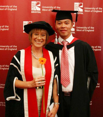 张吕发在西英格兰大学毕业典礼上与老师合照