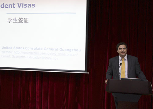 本网讯(记者 刘丹苇 实习记者 李颂秋) 11月13日,美国驻华大使馆国际教育之美国文化及教育巡回讲座在F101学术报告厅举行。美国驻华大使馆新闻文化处EducationUSA高级教育专员杨嘉伟和美国驻广州领事馆签证官分别讲解了学生赴美留学的升学规划和学校申请以及签证问题。副校长余庆安出席了本次讲座。