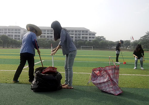 同学们携带清扫工具在田径场上集合,以宿舍为单位组成小组进行清扫。由于工具有限,大多数同学都是直接用手捡起草地上的树叶和废屑等垃圾。他们蹲在地上,认真地清理垃圾。虽然有点脏,有点累,但同学们没有怨言,用自己双手为美丽的校园奉献出一份力量。