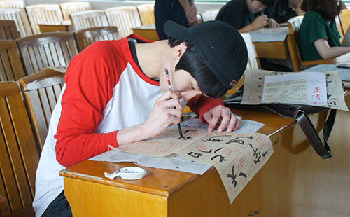 留学生认真练习书法(戴诗杰 摄)