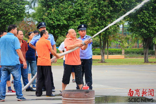在介绍消防水带的使用方法时,由保卫人员现场示范如何使用,郭全伟一边讲解。他说,消防水带需3人同时使用,在握住水管枪头后,两人需要分两侧站,并往上喷水灭火。