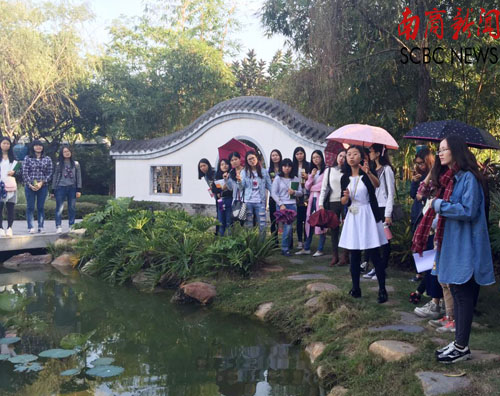 本网讯 11月2日下午,国际工商管理学院2012级旅游管理(国际酒店)班《园林艺术与欣赏》课程走出教室,在室外开展了一次园林课程的校内实践教学活动。