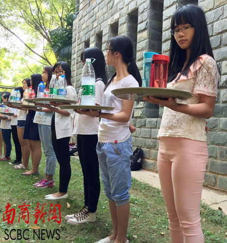 又讯 近日,2013级旅游管理专业餐饮管理的托盘实践课程在G栋旁小树林开展。