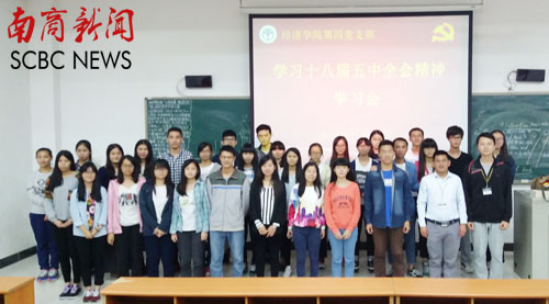 本网讯 11月10日下午,国际经济与金融学院第四党支部于F102学习十八届五中全会精神。该支部全体党员以及部分入党积极分子共33人参加了学习。