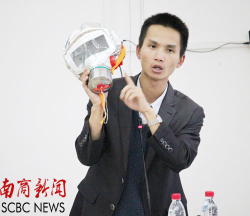 罗昆松重点讲解了防烟面具、灭火器及烟感器等消防工具的使用方法。他指出,在许多火灾事故中,大部分遇难者是被浓烟呛死,因此防烟面具在火灾中则显得尤为重要。为此,罗昆松亲身示范了防烟面具使用步骤及其使用时的一些注意事项。随后,他又讲解了灭火器的各种类型并且向大家示范了灭火器使用的“摇、拨、瞄、压、扫”五大步骤。