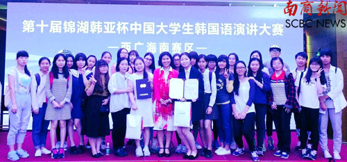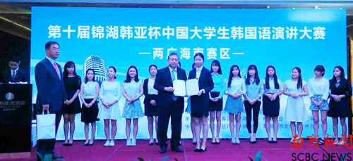 本网讯 11月21日下午,第十届“锦湖韩亚杯”中国大学生韩国语演讲大赛两广海南赛区比赛在广州举行。来自广东、广西、海南等地高校的共17名选手参赛。我校2012级朝鲜语系的陈嘉庆和袁思婷分别获三等奖和优秀奖。