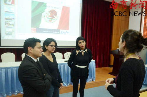 11月25日下午,该校师生与我校西班牙语专业师生与在F101进行交流。交流会上,墨西哥塞拉亚大学Luis Fernando García Ramirez教授向大家详细地介绍墨西哥、塞拉亚城市和塞拉亚大学。随后,该校3位学生就社会服务、质量相关项目和小孩家庭教师等方面,分别介绍他们利用自己的商务知识,结合自己亲身体验及专业调研所做的报告。