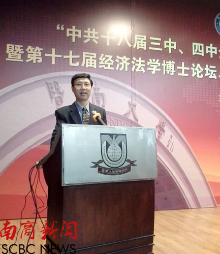 本网讯 近日,“中共十八届三中、四中全会以来经济法新问题研究”高峰论坛暨第十七届经济法学博士论坛、广东省法学会经济法学研究会2015 年年会在广州举行。广东省法学会经济法学研究会会长、我校国际经济与金融学院教授周显志教授出席活动并致辞。