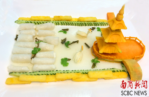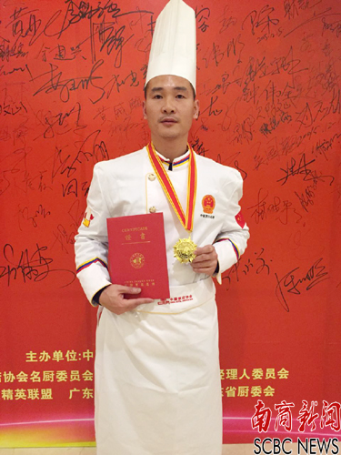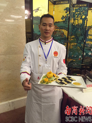 林彦森来到我校教工饭堂工作后,更得益于学校包容并蓄的宽松氛围,与学校饭堂潮菜、粤菜、湘菜等菜系同行互相交流,互相提高,学校优美的环境也给他不少的启发。他的代表菜式“茗香飘南商”创意和灵感就来源于学校的风景,该菜式将亭台楼阁、天鹅、湖景用食物展示出来,在追求色香味俱全的基础上,体现学校的特色。林彥森表示,获得荣誉以后,会更加认真地做好本职工作,更好地服务广大师生。 (餐饮部 黄威良 文大寨)