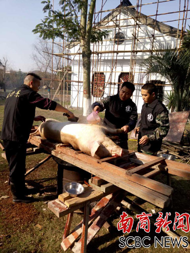 为让留校工作人员、在校外籍教师、在校教职工及家属能共聚一堂,欢欢喜喜过大年,学校安排专门人员准备年夜饭,杀年猪、网大鱼,挑选农场自产的各色青菜,年夜大餐丰盛可口,让人垂涎。