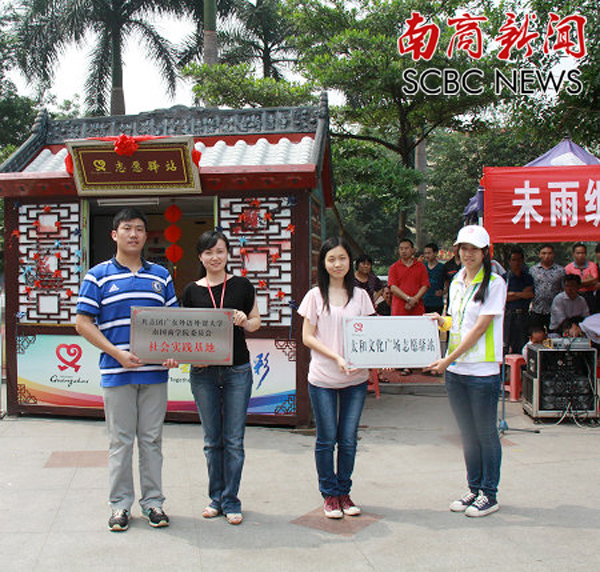 在南商校园,还有一支特殊的队伍,那就是校青年志愿行动指导中心三大队之一的驿站队。作为校青志对外宣传的窗口,驿站队主要负责为社区居民进行外语教学,为附近的群众提供指引、咨询等志愿服务。自2013年5月我校志愿者正式进驻太和文化广场志愿驿站以来,志愿服务从未间断过,风雨无阻,据初步统计,近3年来,共有200多人次在该驿站提供志愿服务,时长达1700个小时。
