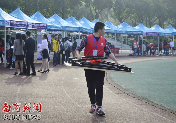 志愿者在招聘会会场搬运桌子 (资料图片)