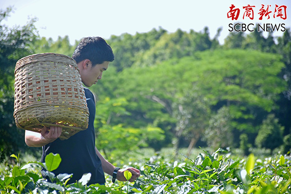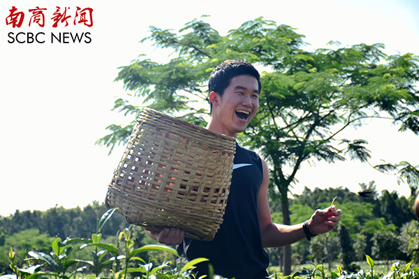 当听到要前往茶园采摘茶叶时,几名留同学立刻把垂在地上的篮筐的绳子揽在肩上,跟着赖老师大步走向茶园。