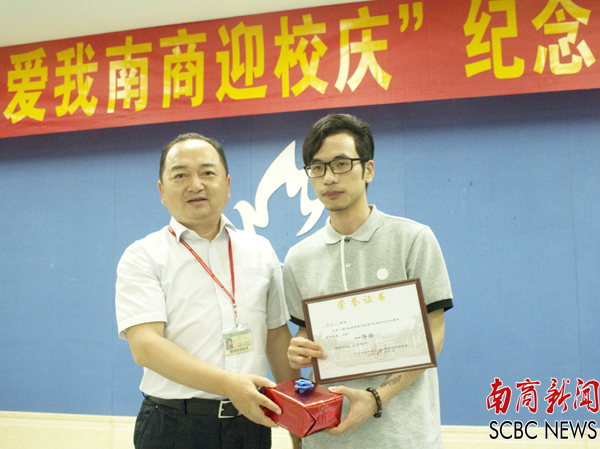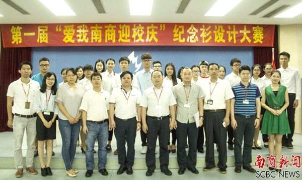 本网讯 5月10日下午,由学校校友总会承办的以“爱我南商迎校庆”为主题的20周年纪念衫设计大赛在C201学术报告厅举行。学校董事长、校友总会名誉会长丁小军,学校党委书记、校友总会副会长黎冬,学校常务副校长、校友总会常务副会长赖志立出席了本次活动。经过激烈的角逐,2010级计算机科学与技术专业校友黄俊一夺得桂冠,并获得“最受欢迎作品奖”。