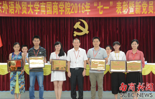 黎冬做重要讲话。他表示,今年是中国共产党成立95周年,今天,我们在这里隆重举行庆祝中国共产党成立95周年“七一”表彰暨新党员宣誓大会,缅怀党的光辉历程和丰功伟绩,学习和继承党的光荣传统。在过去的一年,校党委始终坚持把党的先进性建设与学校的根本任务和中心工作紧密结合起来,为推进学校教育事业的发展发挥了应有的战斗堡垒作用和先锋模范作用。他说,校党委坚持以“三严三实”专题教育和“两学一做”学习教育为契机,扎实推进作风建设;以制度建设为抓手,加强基层组织建设;以党员的教育和管理为重点,提升党组织战斗力,取得不少创新性的成果。比如我校开展的“两学一做”学习教育受到广外党委督察组的充分肯定;2015年我校4个党建课题获广东省高校党建研究会立项,取得历史性突破;校党委学生党建研究会联合“1+1”三下乡队伍以“微梦想·关爱留守儿童”为主题开展的教育帮扶志愿活动,获得省委教育工委暑期大学生党员社会实践活动项目立项,并受到省委教育工委的点名表扬等等。过去的一年,党委在党建带团建,党的宣传工作、统战工作和工会工作等方面也都取得了不错的成绩。
