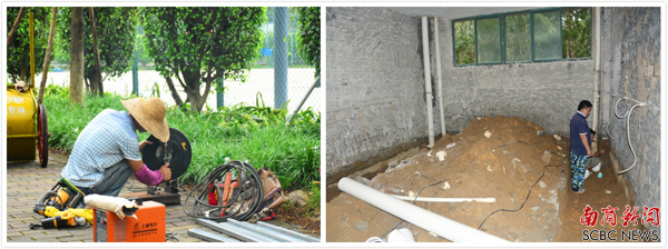 上图为施工人员顶着烈日抓紧施工,下图为教学楼E座洗手间改造 (陈阳 摄)