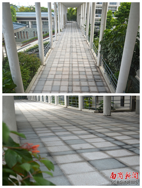 每年的雨季,F、G座的走廊总会有师生因地板太滑而摔倒,学校特别为师生改装了防滑地板。