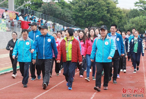 本网讯(记者 彭冬清 实习记者 吴英杰 覃金兰)健步走是本届校运会新设项目,也是校运会首日精彩看点之一。