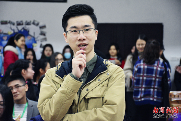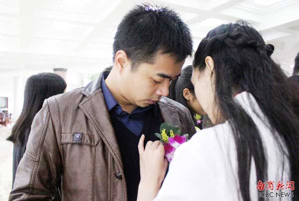 为敬爱的师兄佩戴胸花(实习记者彭格格 摄)
