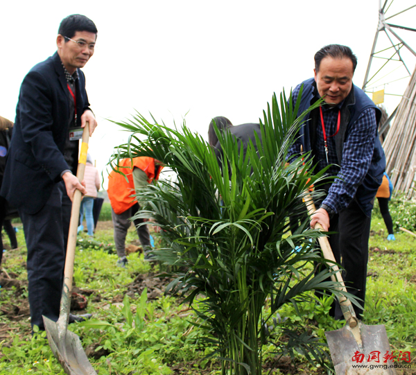 本网讯 3月9日下午,我校杨永强副校长与学生处、校团委、后勤部门工作人员,会同校学生社团联合会全体成员及校团委各学生组织、各社团代表在校农场规划地种下散尾葵等树木,以实际行动唱响“学雷锋扬正气 兴植树美南国”植树节主旋律。