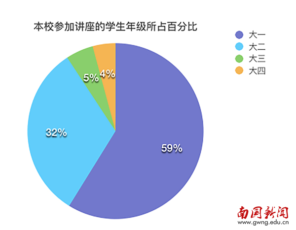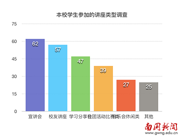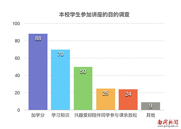 发起此次“求知or求分”问卷调查,记者旨在通过了解我校同学们对参加讲座的态度而深入了解大家的学习目的。而调查结果显示,在南国有近八成的学生是为了得到学分而去听讲座的。在调查的学生中,有超过五成的同学表示自己会偏向于参加企业校园宣讲会类型的讲座,因为宣讲会可以让在校的学生更好的了解当前社会的就业形势,以便于学生们为自我发展找准定位;此外,仅有四成的学生表示自己会参加学术性较强的讲座,因为学生普遍认为,学术性讲座所讲述的内容实用性不强,对自身目前的发展没有实质性的帮助。