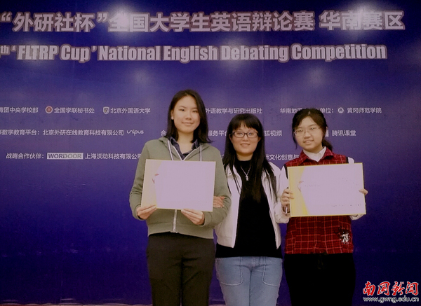 来自华南地区12个省份130所高校近300名选手参加了本次比赛,我校代表队由2014级英语专业(新闻传媒)方安婷和2015级金融学(双语班)范琳苑两位同学组成,大学英语教学部夏佳佳,李映蓁两位老师担任指导。经过5轮循环赛和1轮地区决赛的激烈角逐,方安婷与范琳苑凭借扎实的语言功底、灵活出色的反应能力、活泼阳光的台风和良好的心理素质脱颖而出,代表我校成为华南地区晋级全国总决赛的30支队伍之一。